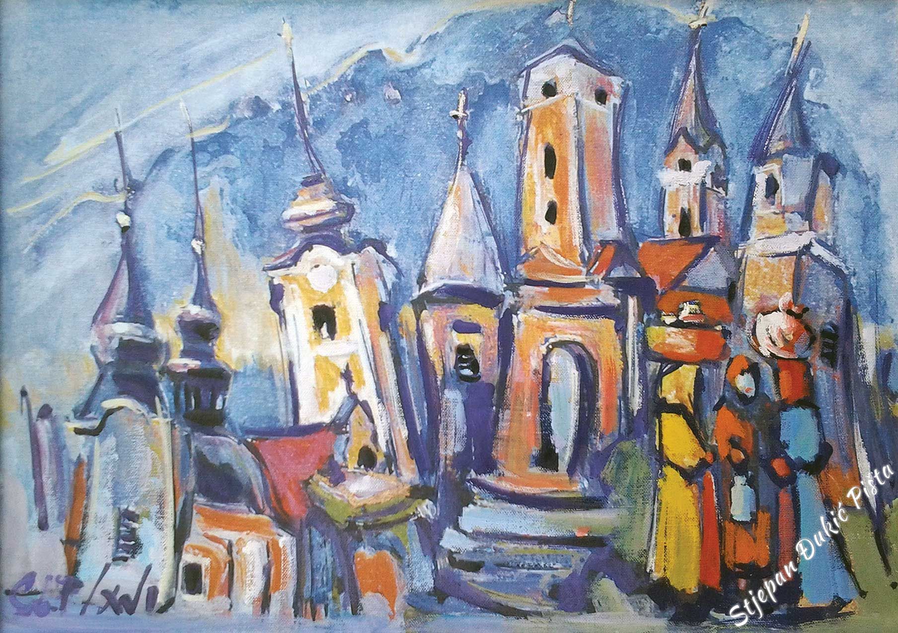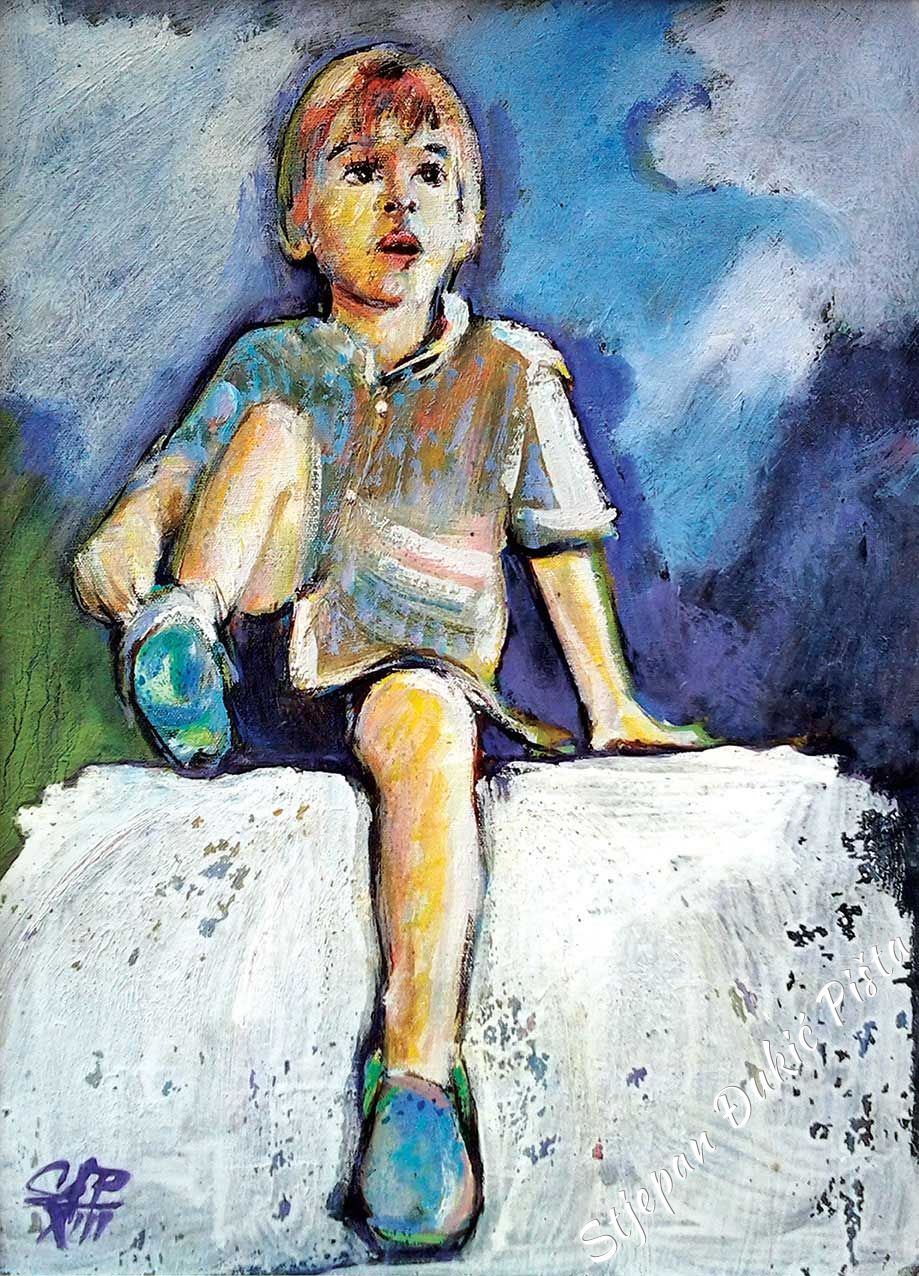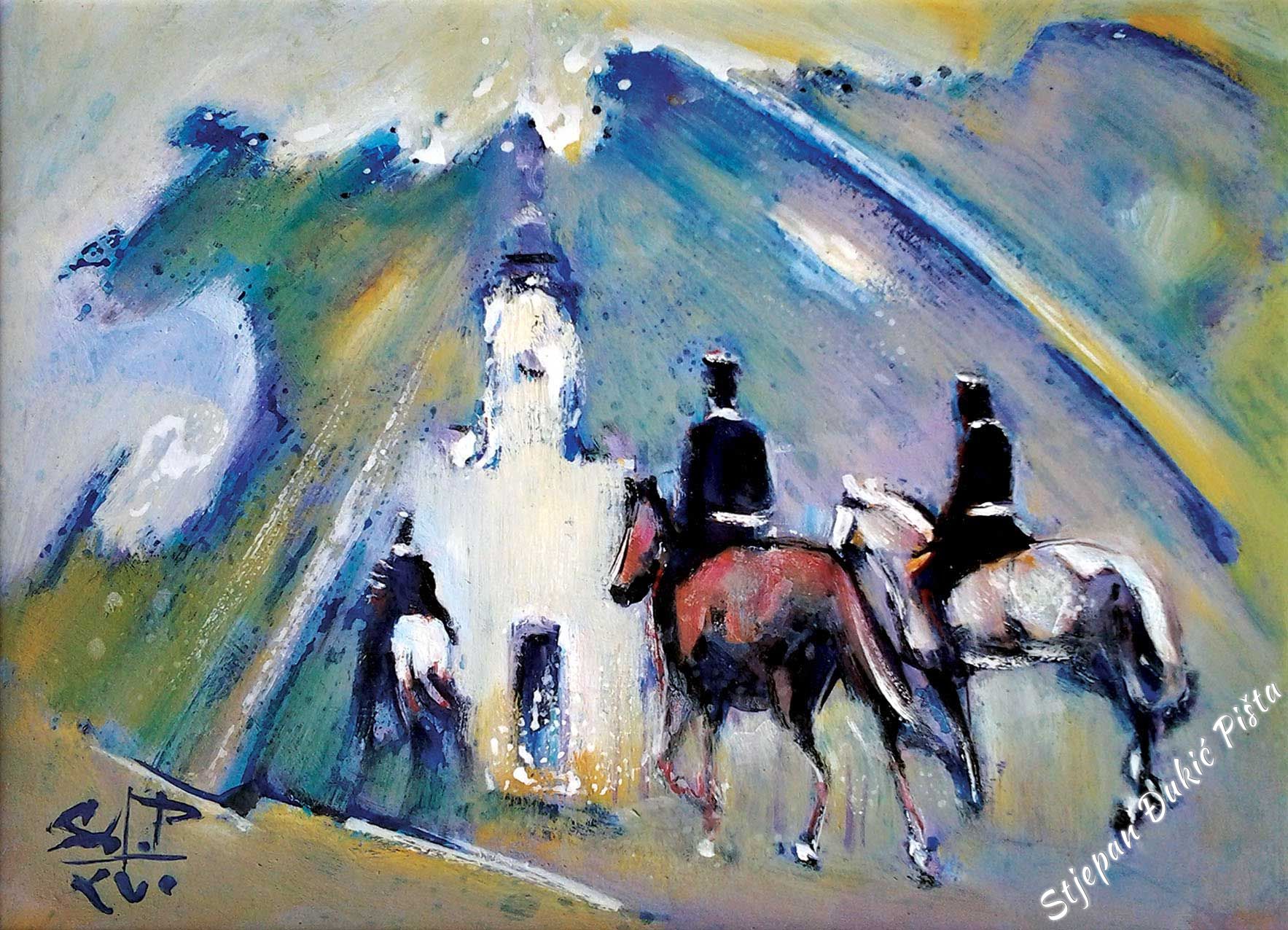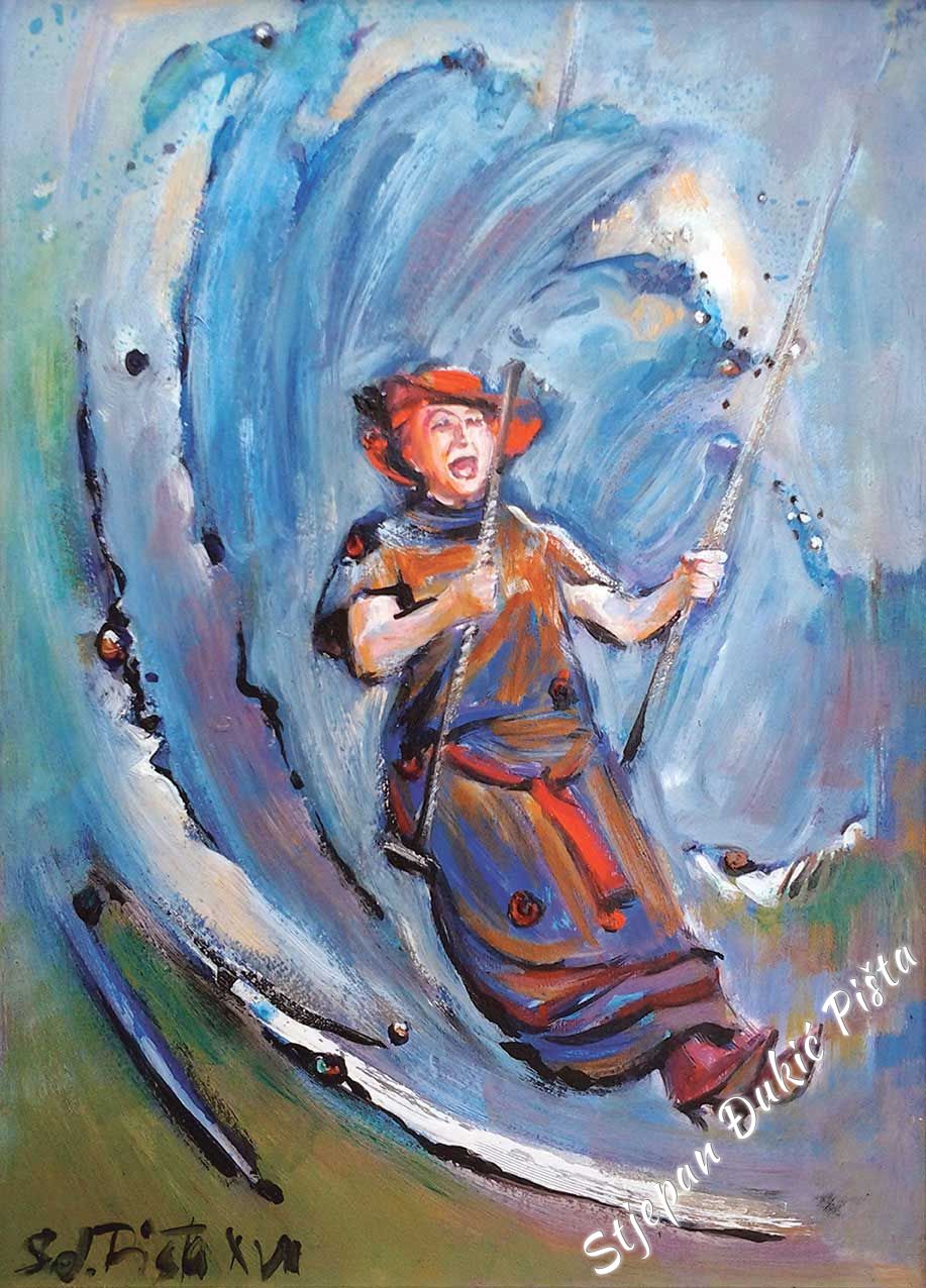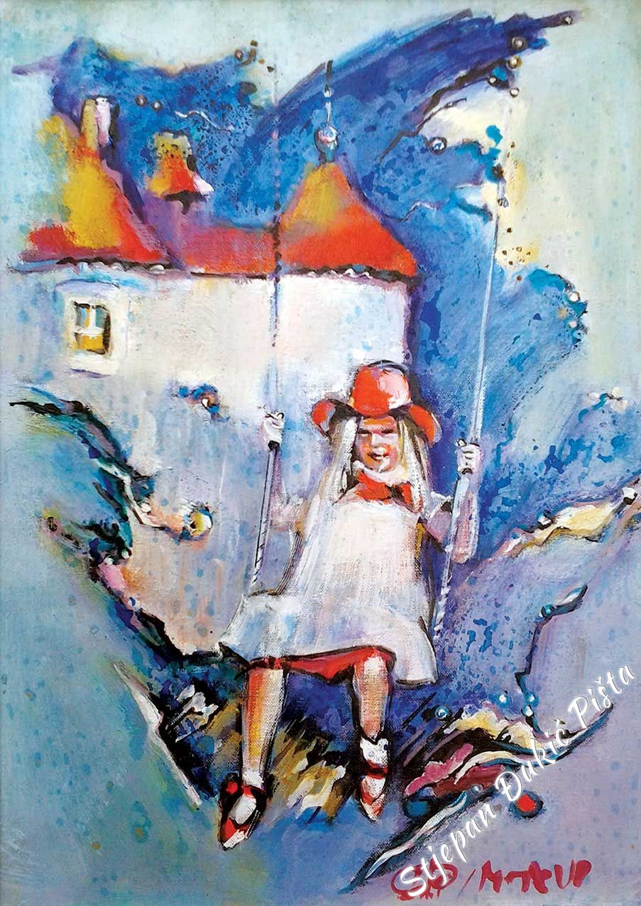 The created impression is the trump card for the associative, multi-meaning under the veil of fantasy. In the raster of portrayals, the vision of the horizontal is a nucleus of intrigue, since the included likable fables have the other side as well – encouraging the viewer to move away from the picture close-up, because the fine lines contained overcome him. For Djukic, the screenplay with all the sequences is indispensable. But as the first step only. Beginning from the firm standing on the ground, he was transformed into a dreamer. The narration didn’t lose its facts, even its pungency, but the yearning for the view from above “infiltrated” the “gravity” of the picture. Djukic’s reaction was the only one possible. Zagorje is the space that engrossed him and took over him. Any by using art, he thanked for its hospitality in turn. The life particles, brought into the artistic expressions, give at least the small portion of the halo. Because, even though slightly, humanly sincere, it belongs to the cathedral of spirit.