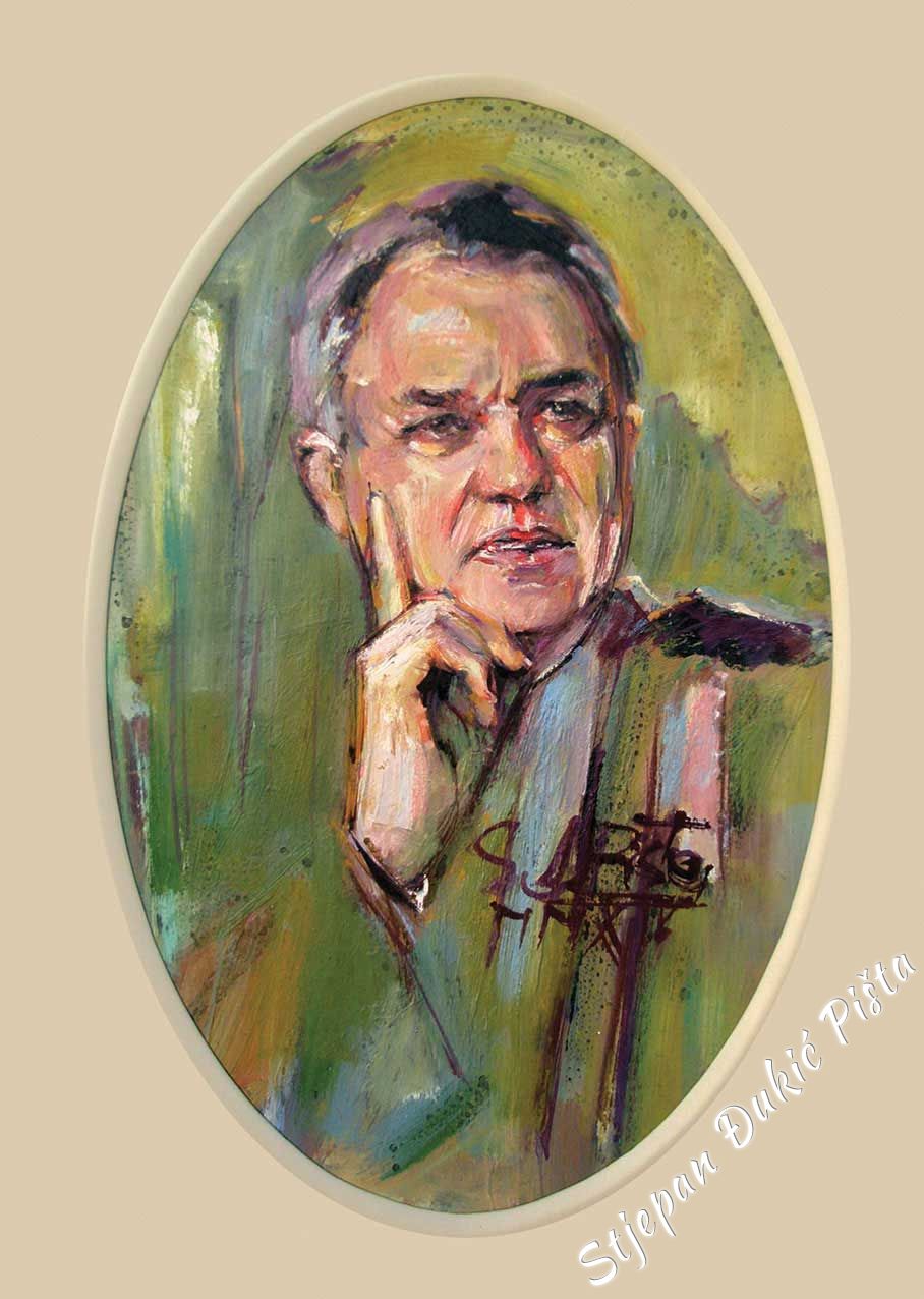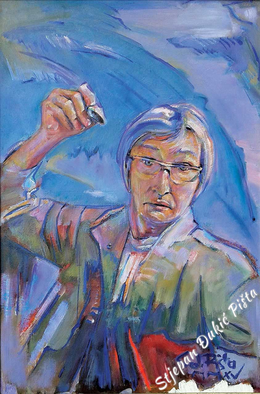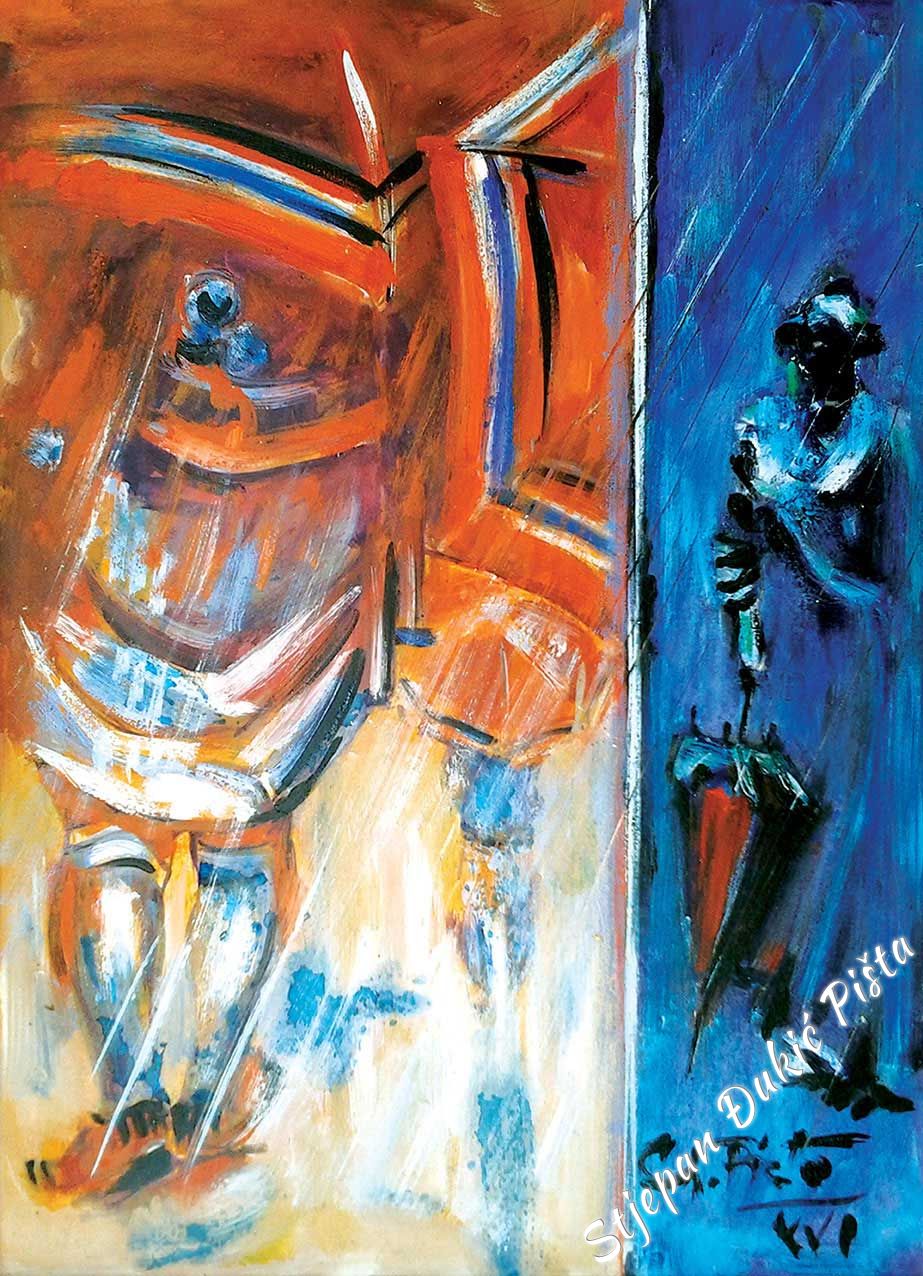 Its already a long time ago that Djukic developed his handwriting, his figurative vision, implemented by the original character of form, the volumetric and sketch bodywork crafted by the correlation of the realistic description and stylization, enriched with typical graphisms which are characteristic to him. Sometimes Djukic releases himself to the expressionistic openness, but also returns to his sense of form with a palette of coloristic echo which resonates from a scream to the sfumaturic tenderness. Nevertheless, the dominant chromatic values rarely reach the extremes, because Djukic took care of the colour without aggression and “missing” the tone. By outlining the form, he defines coloristic arrays of characters, which are in tune with the space’s palette, very often made deeper by the diffusion of light. Making a rhythm with colours, like a lifeblood vein, matches the biorhythm of composition, or more specifically, the layout which is suggested by the content layer of the display. Djukic never falls into layout schemes, his picture organism lives with inner motive charges. In the plans fractions exist relationship turnarounds in a narrower sense and the orchestration of the whole. Djukic lucidly, by the logic of a specific image, shifts the “anecdote” towards the oasis of incidents and the space dynamics, as well as the test of time, comes in the focal point of interest. The rule is that there isn’t no rule. Djukic always remains himself, but seeks and finds different climaxes in avoiding effects of scenography by being interested in what is contained within an object, as well as the body and the drapery. In the order and chaos of forms a horizon line is hinted, a line which is even more than just a line. Even undescribed, it exists. As a metaphor, spreading across images and outside of their borders.