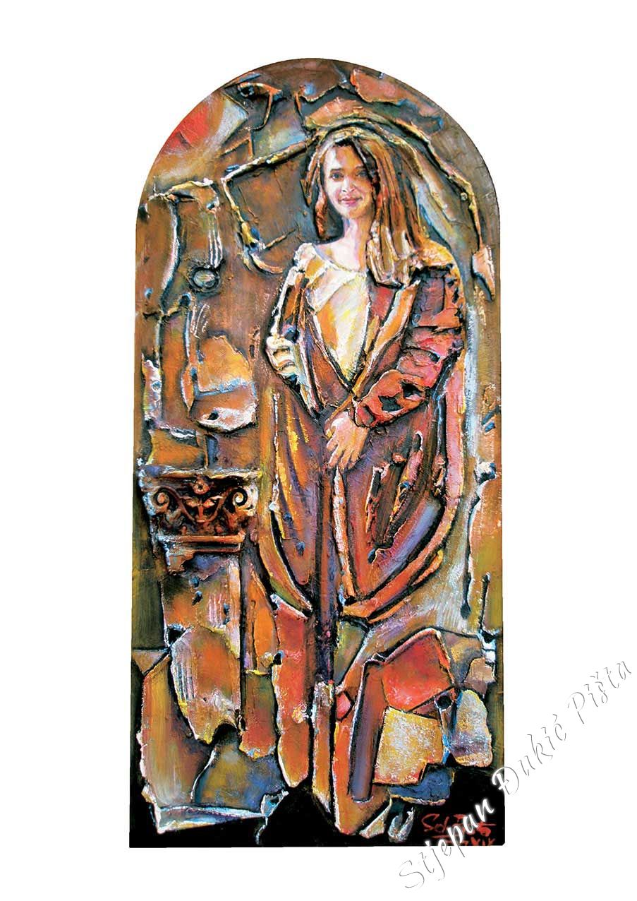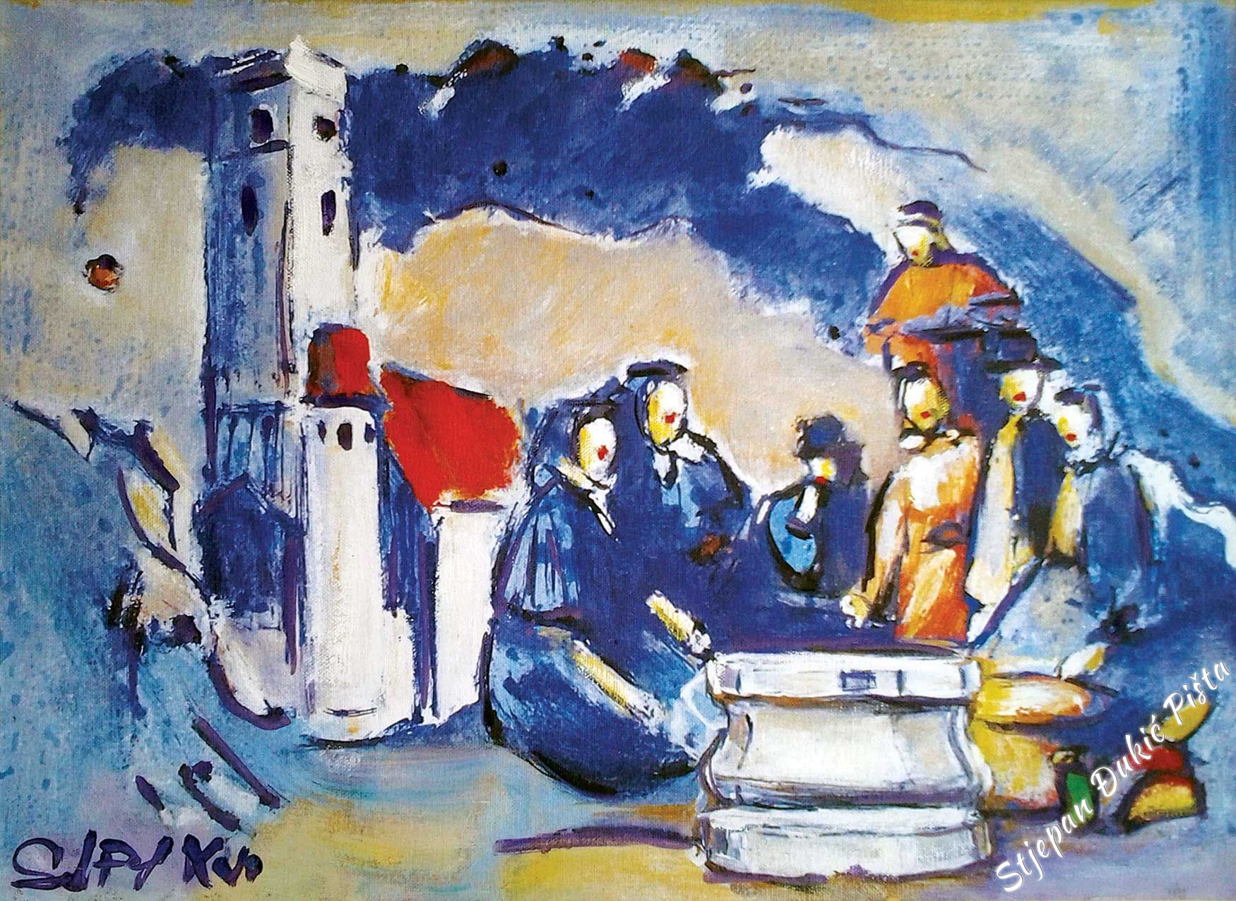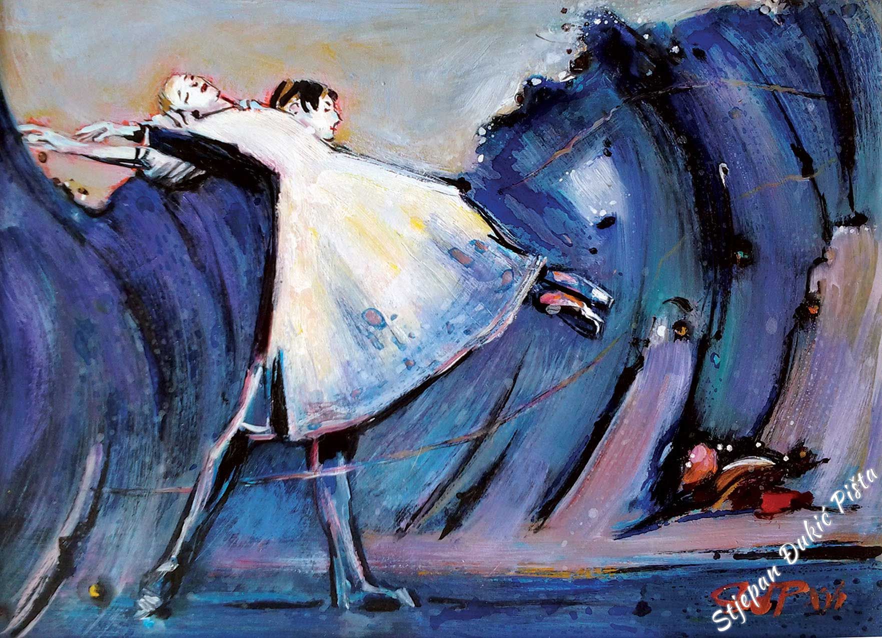 Its already a long time ago that Djukic developed his handwriting, his figurative vision, implemented by the original character of form, the volumetric and sketch bodywork crafted by the correlation of the realistic description and stylization, enriched with typical graphisms which are characteristic to him. Sometimes Djukic releases himself to the expressionistic openness, but also returns to his sense of form with a palette of coloristic echo which resonates from a scream to the sfumaturic tenderness. Nevertheless, the dominant chromatic values rarely reach the extremes, because Djukic took care of the colour without aggression and “missing” the tone. By outlining the form, he defines coloristic arrays of characters, which are in tune with the space’s palette, very often made deeper by the diffusion of light. Making a rhythm with colours, like a lifeblood vein, matches the biorhythm of composition, or more specifically, the layout which is suggested by the content layer of the display. Djukic never falls into layout schemes, his picture organism lives with inner motive charges. In the plans fractions exist relationship turnarounds in a narrower sense and the orchestration of the whole. Djukic lucidly, by the logic of a specific image, shifts the “anecdote” towards the oasis of incidents and the space dynamics, as well as the test of time, comes in the focal point of interest. The rule is that there isn’t no rule. Djukic always remains himself, but seeks and finds different climaxes in avoiding effects of scenography by being interested in what is contained within an object, as well as the body and the drapery. In the order and chaos of forms a horizon line is hinted, a line which is even more than just a line. Even undescribed, it exists. As a metaphor, spreading across images and outside of their borders.