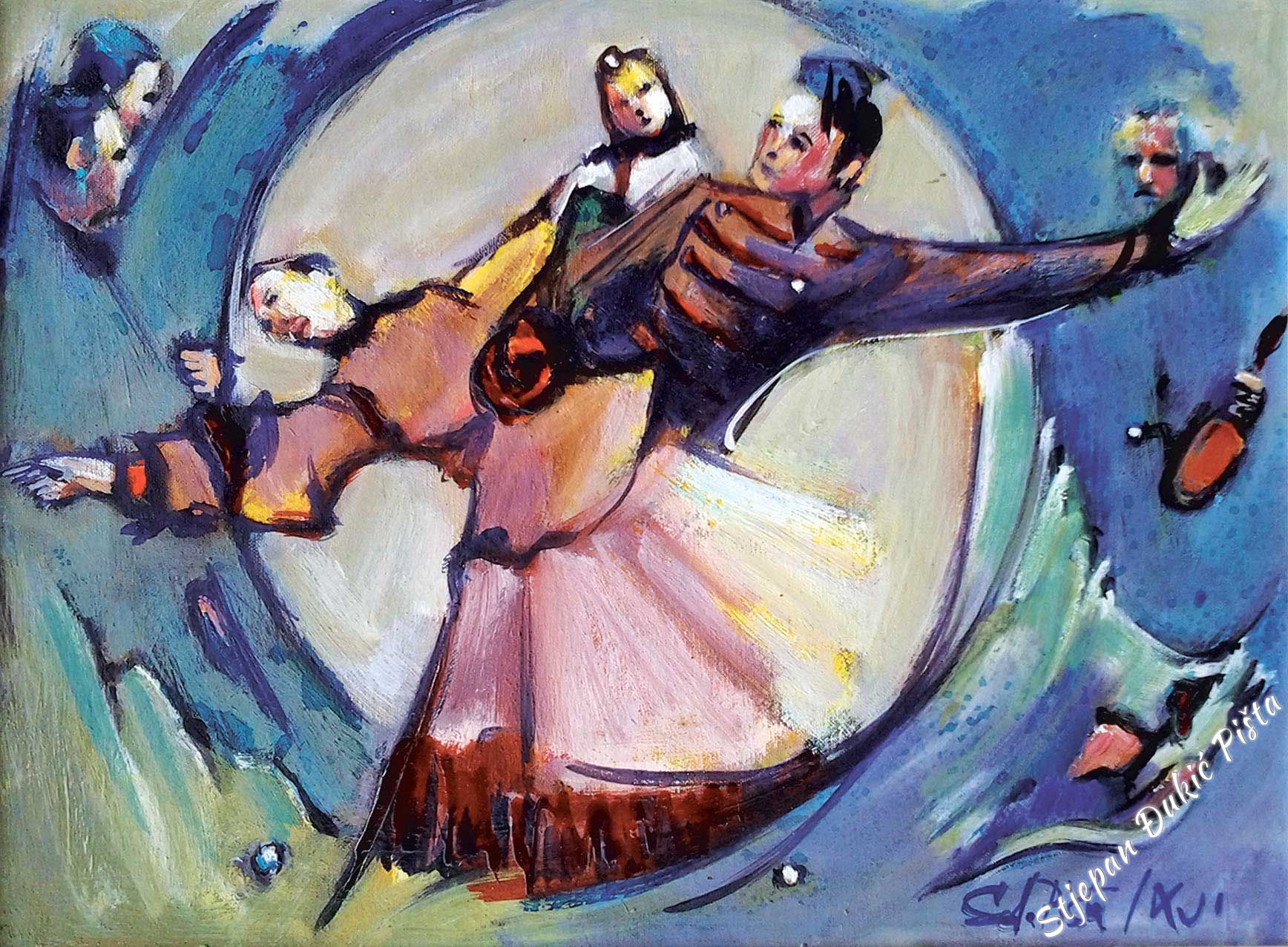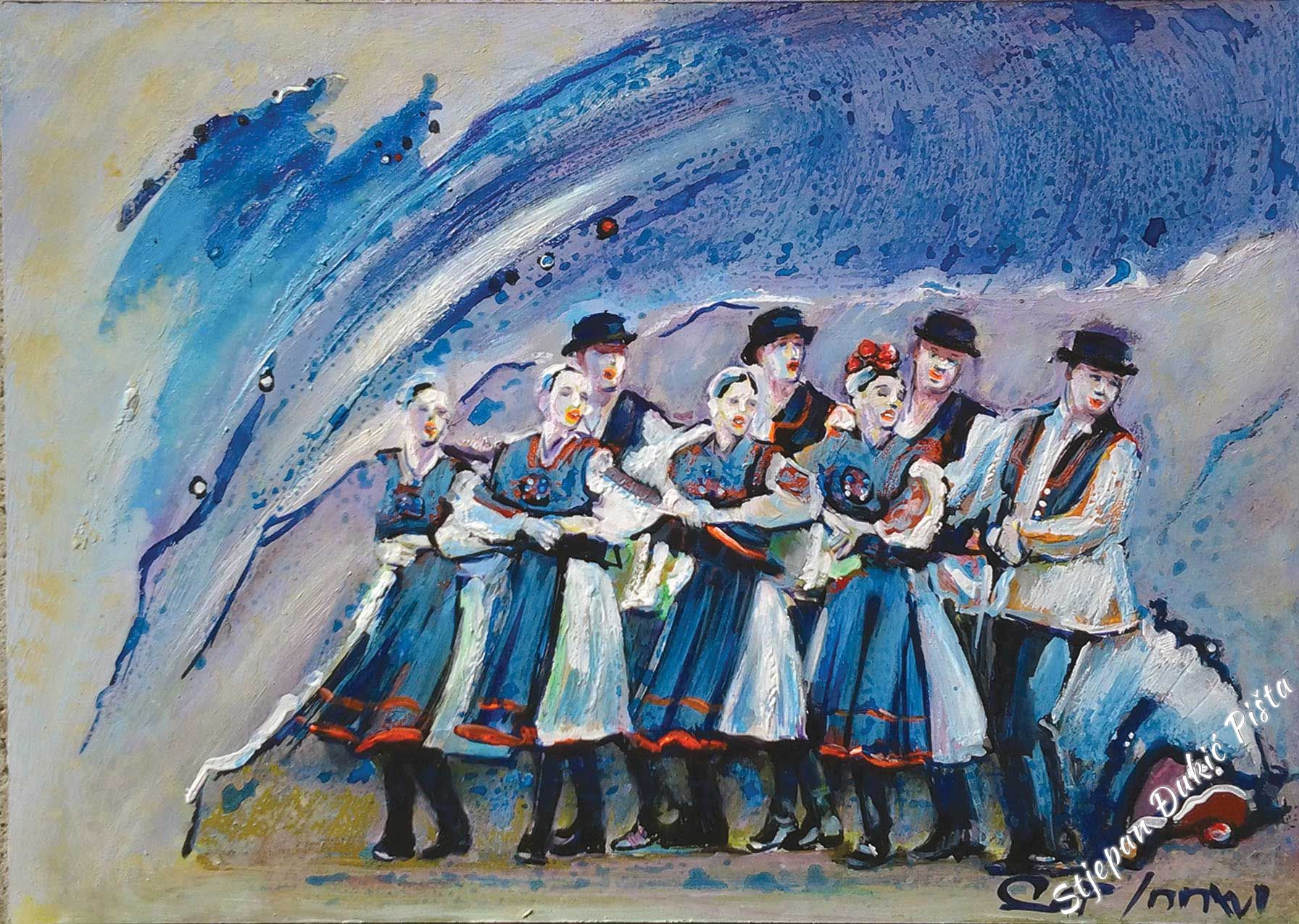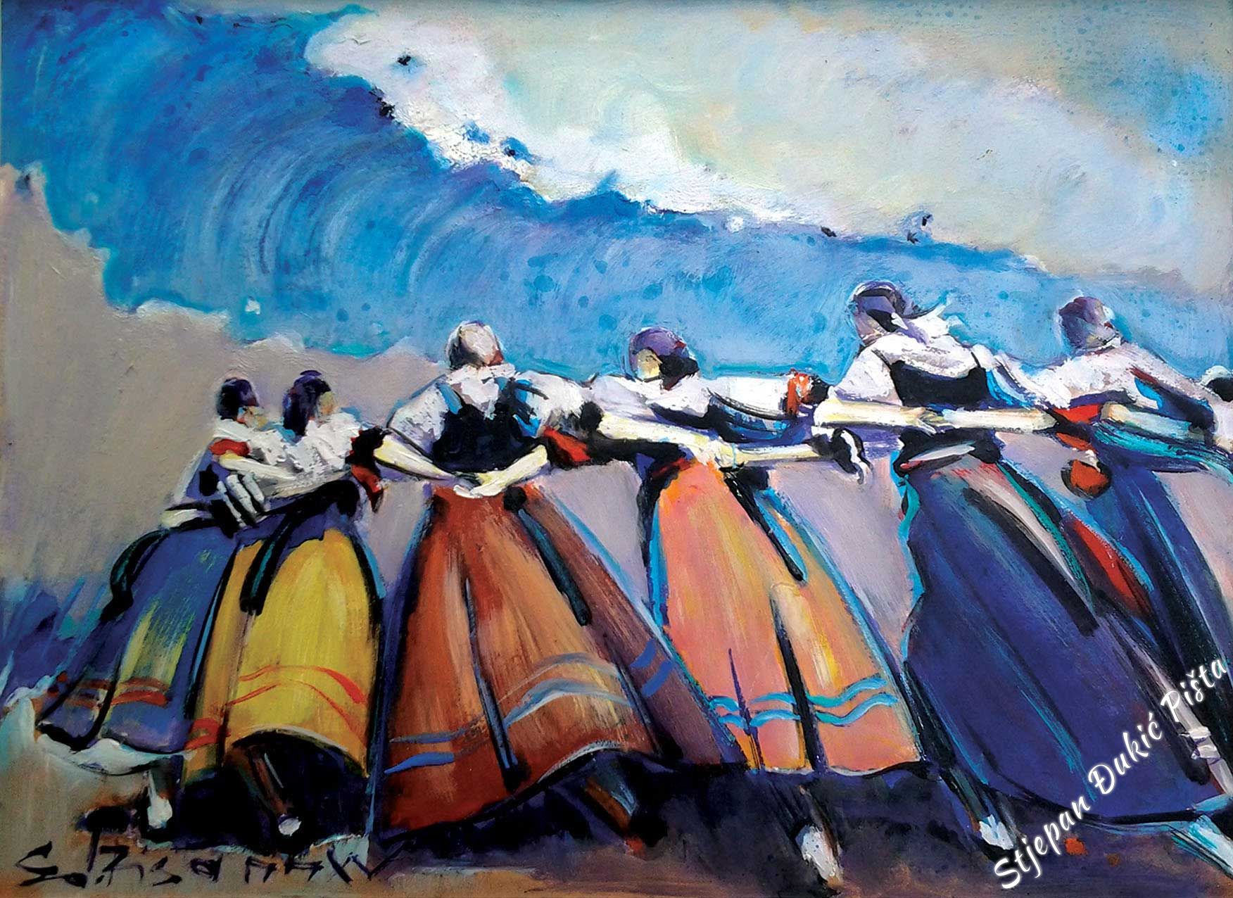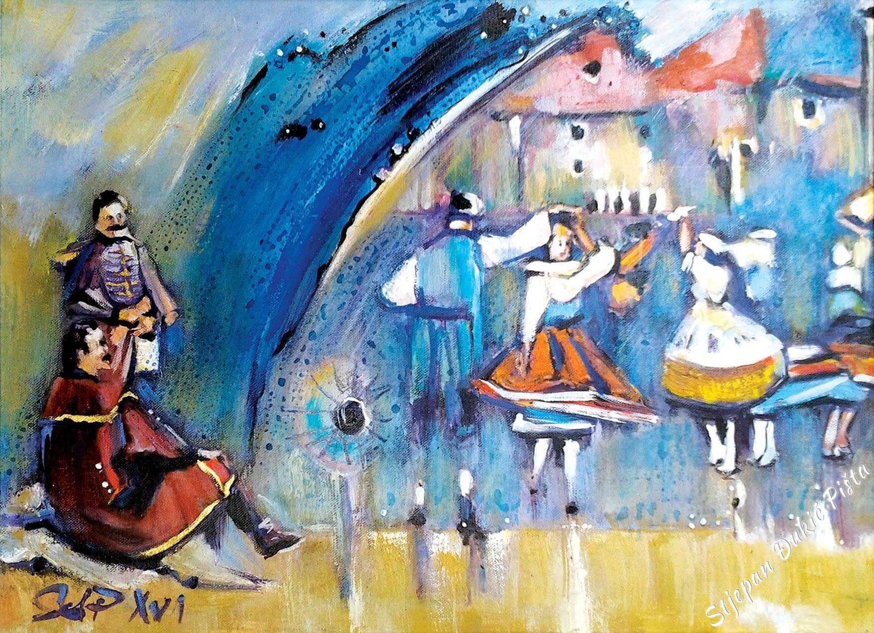 An intriguing title of the exhibit points out its layerness, a literary note in the core of the initial concept. Stjepan Djukic Pista in his earliest artistic accomplishments often thought about the art piece through the synthesis of fine art and the content’s message, brought upon by the interesting iconography. He wasn’t aspiring towards the labyrinth of the enigmatic , rather, finding the inner richness of motives in the simplicity of the "stories", the driving force which gave the historic dimension to the daily characters. The title of this exhibition also contains a hidden idea of the general within the individual, of the events that go beyond the defined short lifetime. Djukic is always preoccupied with the flow of time, the energy contained within days and years, recognizing in this series a harmony of continuity, but as well as the conflicts which disrupt the existence balance. In his previous series, Djukic chained the figurative with the abstract (with stripes that had a geometric foretoken) which are literally, and also in the symbolic way, the signpost of grading the life rebus. In the latest genealogy of his latest series, Djukic opens and closes the circle of situations and states which an individual or a group of people go through in borrowed spaces, in the standards of the monumental and customary as the tags of identity. A display of a specific event is linked with the main part and the core of the whole and is also a component of the life polyptych , which by the artistic imagination receives a metaphysical note. Stjepan Djukic Pista converts the experience and knowledge impulses in encounters of adventures and events, portraying how the initial symbolism of the grain of salt grows into the spiritual splendour. That which is banal in its illusion has aspects of wider visuals, it is a housing of related, calmness in the torrent, a flicker in the stops. In other words, every scene has its own self-sufficiency and every accent is an echo of artistic observation. In various variations, Djukic brilliantly reacts to all changes in the life’s focal points, youth, maturity and years worthy of every respect. In example, the ethnographic, architectural heritage truly exists in Djukic’s pictures, within historical individuals and contemporaries (portrayed with portrait-like precision), in the steps and set-ups of dances (a choreography affirmed by professional ensembles, in the caste presence, and the landscape topography). Djukic as the first-class portrait maker, in showcasing individuals known to him, but unknown to us, brought in the “zagorje session” the personas which in the past but as well as the present left their mark in this dear space. Even Oton Ivekovic , the great Croatian painter that lived between the 19th and 20th century, known for a long range of pictures representing Croatian history, is linked with his life to the castle Veliki Tabor . Alongside of him, there are PhD Antun Presecki , a man that did a lot of great things for the region through various activities, and Ziga Popijac , a peculiar sculptor of outstanding virtuosity, which transfers the authenticity of expressions of folk tradition, that are just a part of the character gallery. The small stories raise the dramatic temperature of expression on every location. Djukic isn’t just a neutral watcher, rather, by using emotional threads, almost becomes a participant of the expression with activity in the total motive matter, visible in the presence of spaciousness of images, sewn into the vitality dialect, Djukic’s need for work as the regeneration corridor. On the artistic side, just the stylistic consistency ensures for that to happen.