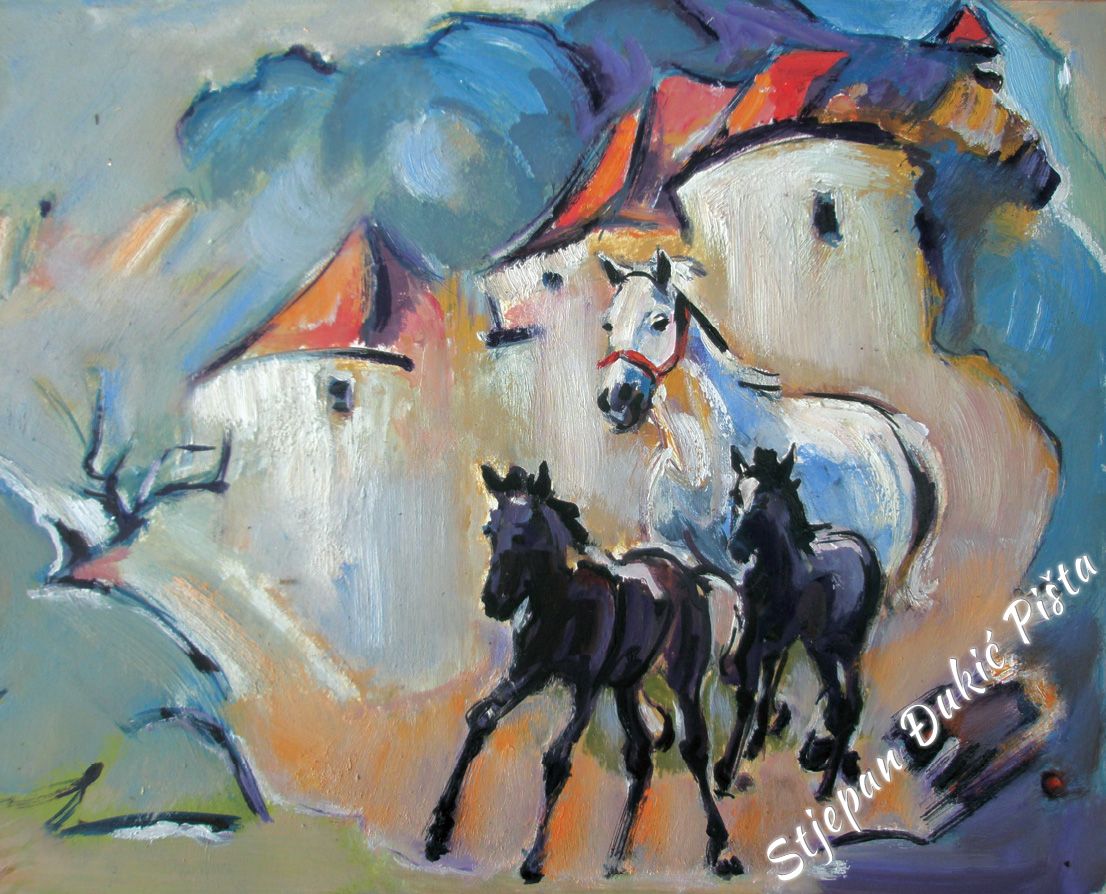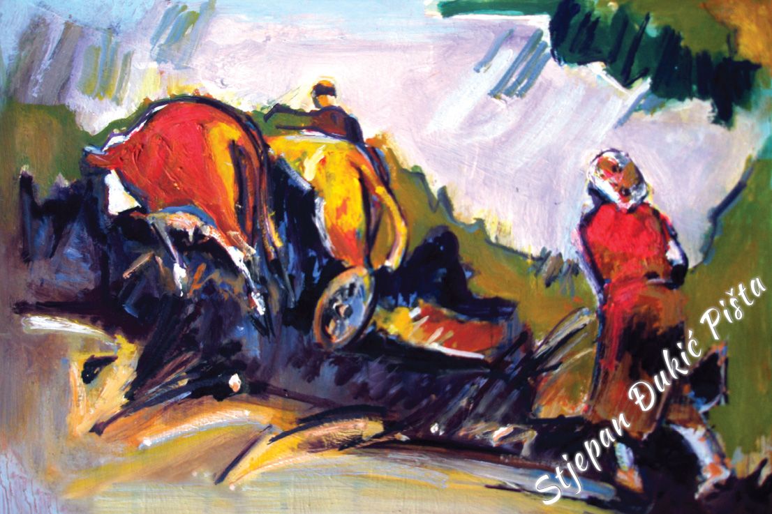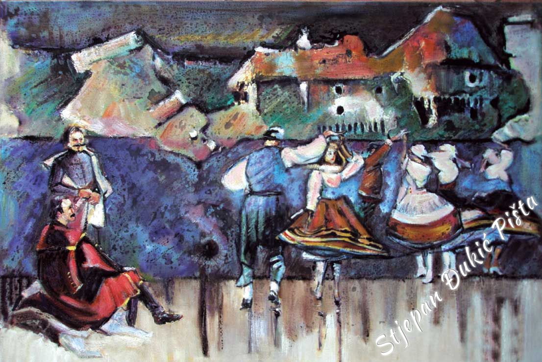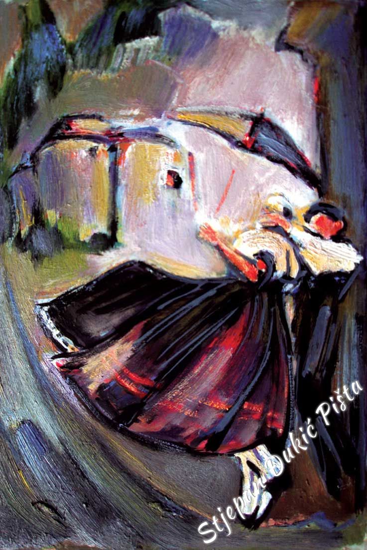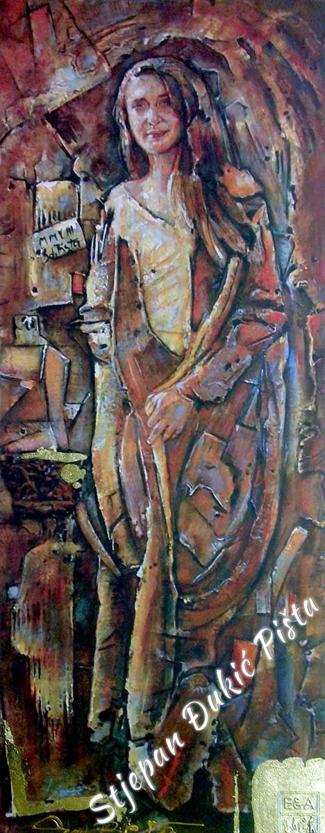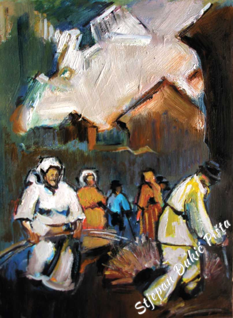 Stjepan Djukic Pista is undoubtedly a skilful painter, a great portraitist who mastered the secrets of the craft, artistically very potent, but the strength of his works lies in the need of thinking about the world in which he found himself and the intensity in doing that. He starts with a Human, tries to understand him, because it is he who shapes the history. He travels from birth to death and in different ways, deliberately or unintentional, impacts the destinies of other people.