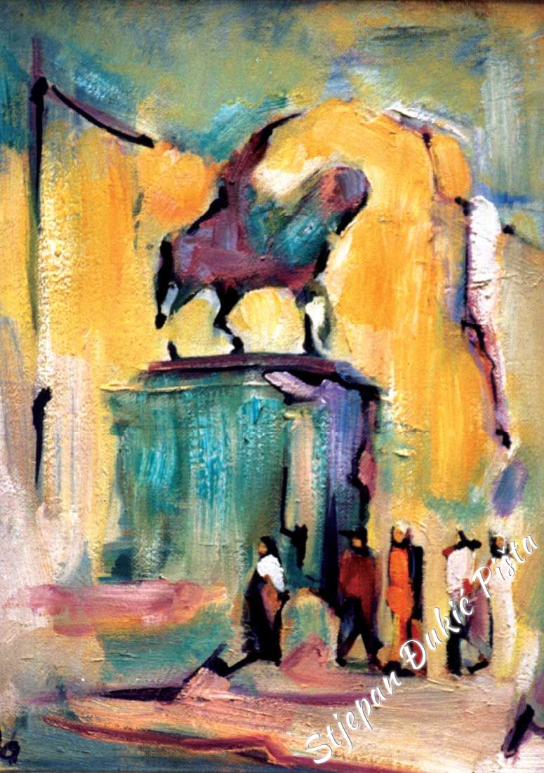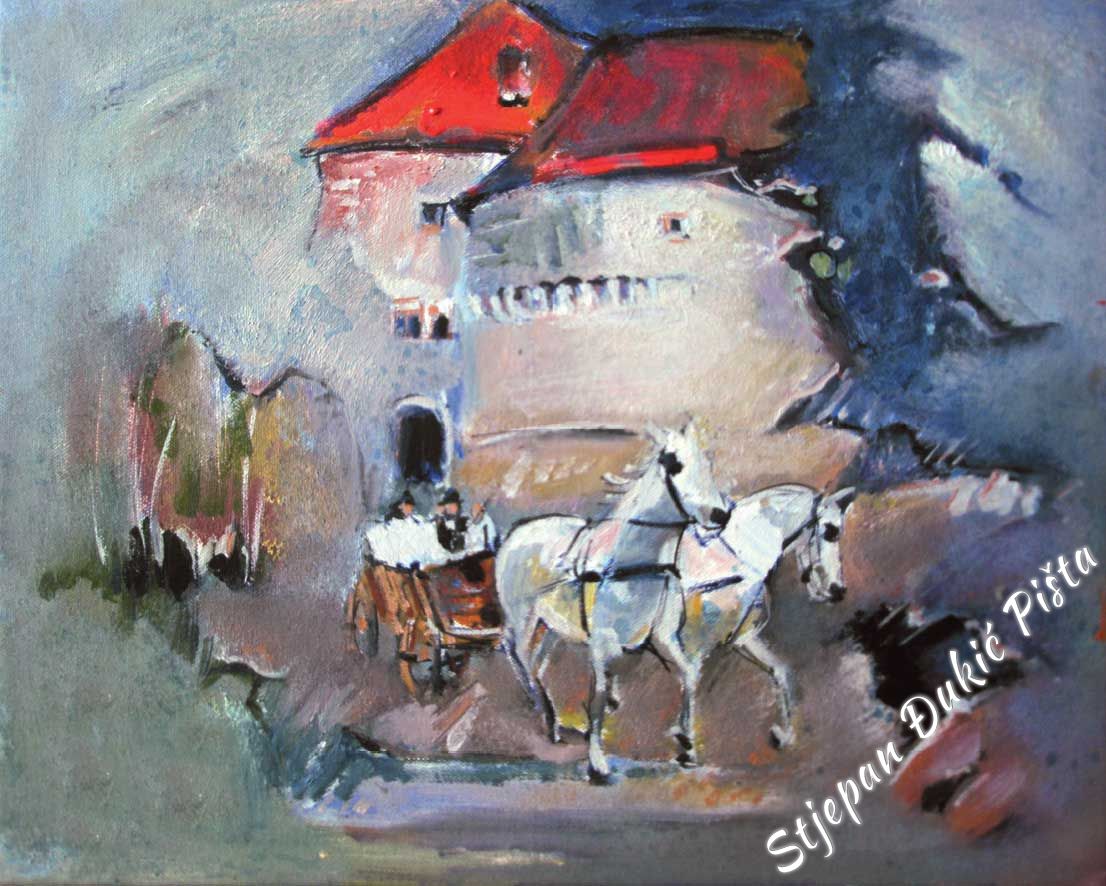 Pista achieves what many artists are trying to achieve, but only a small number of them does: to link history and the present, reaching - timelessness. Doing so, he uses the tension of opposites confrontation. With a keen sense of composition, in the serenity of Zagorje hills, he brings powerful movement, the dynamics in a static environment, a solid plastic in a soft green color.