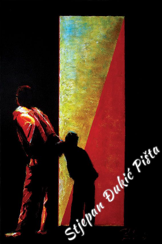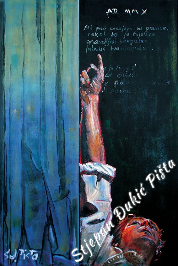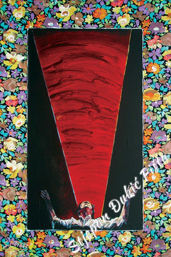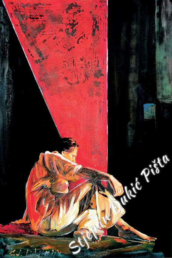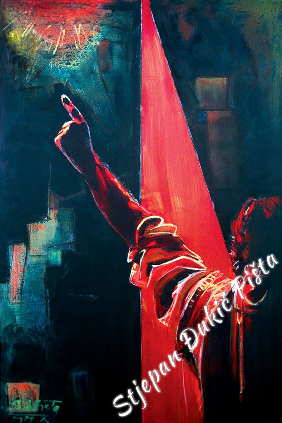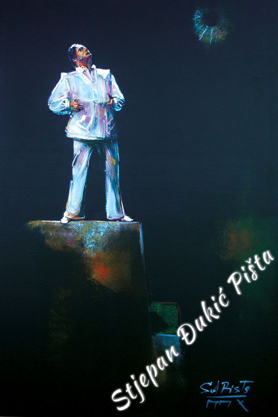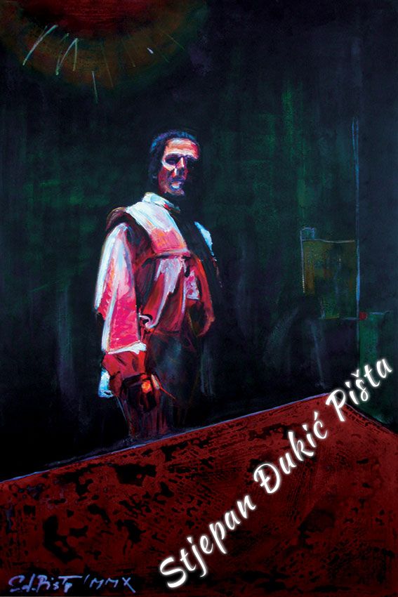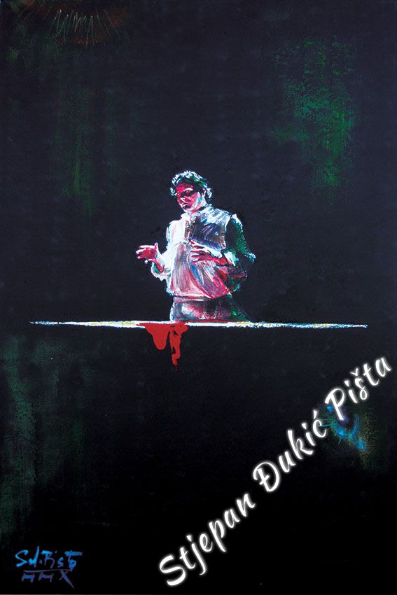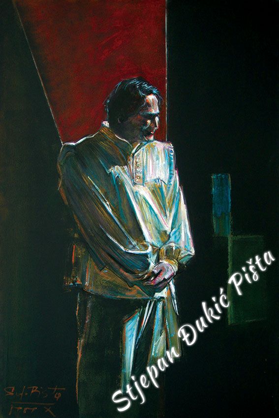 Stjepan Djukic Pista approached the "Ballads" in the original way. Being acquainted with Krleza's poetry, he didn't describe the situations and states, rather, he displayed the spirit and strength of the writers piece through an impressive act by the actor Adam Koncic . Observing the expressive actor's performance, his experience of certain parts of the "Ballads", he painted the layerness of the text over the character of the artist, face and body, position and gesture, just slightly accenting the precise portrait lines. The portraits aren't descriptive but are exceptionally persuasive, with a hint of the necessary realism. Djukic insists on the atmosphere, to recognize the content, on the relations of the meditative parties and those brought on the verge of screaming. The achieved charge by light accents, scene crashes and introducing iconographic fragments and the national symbols.