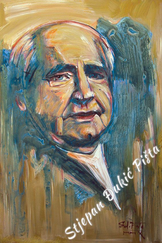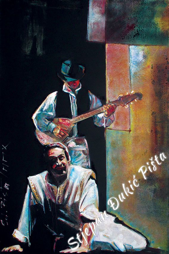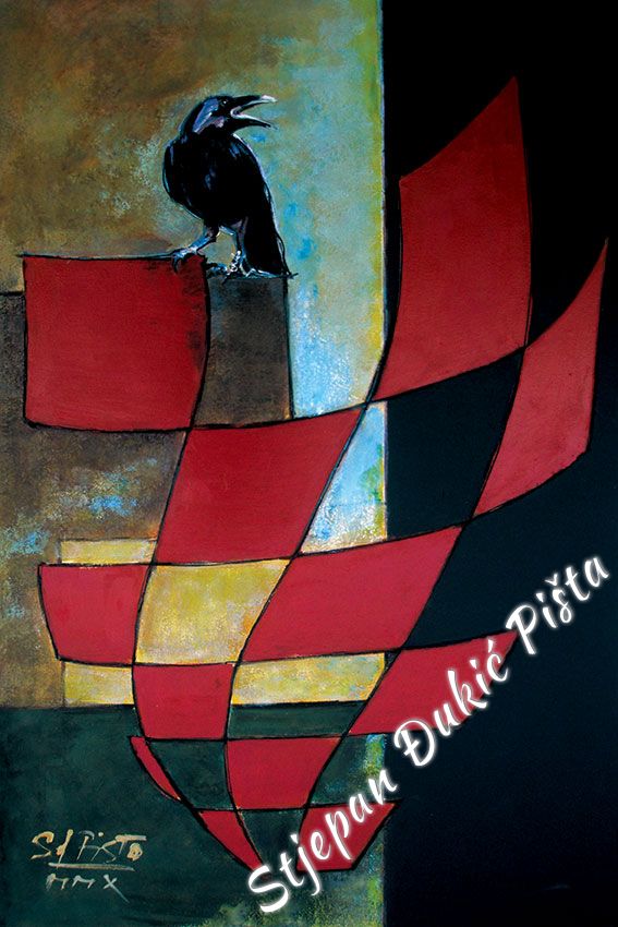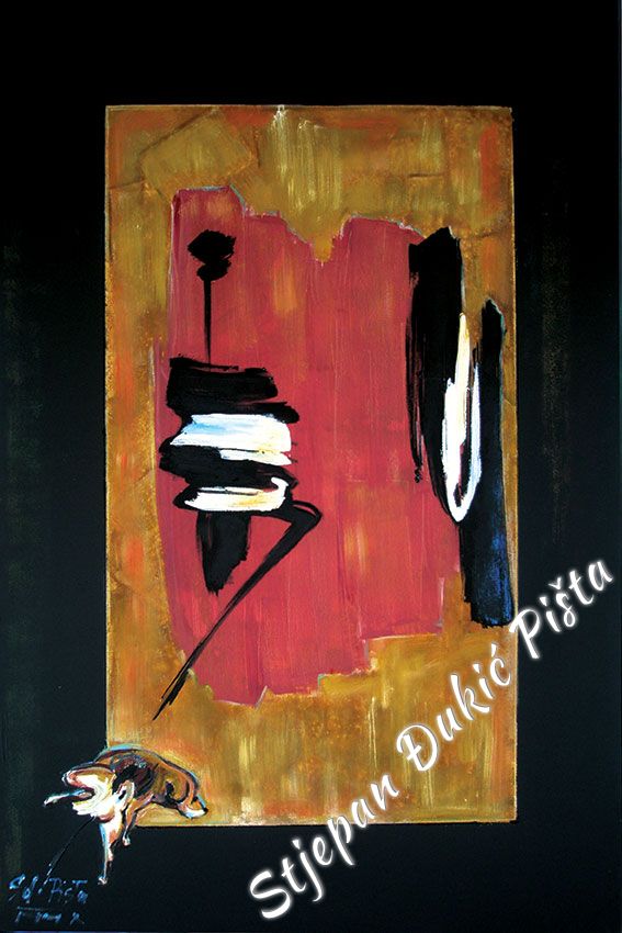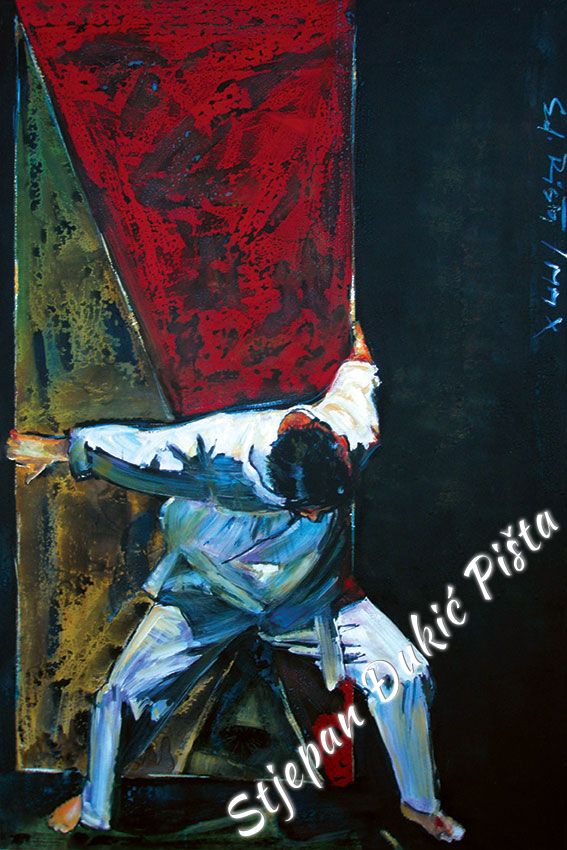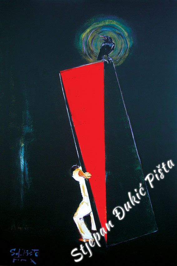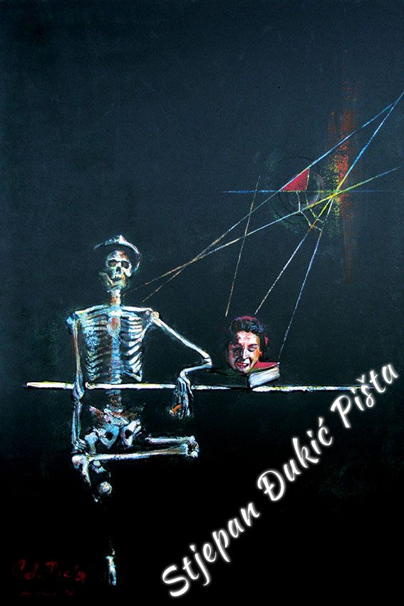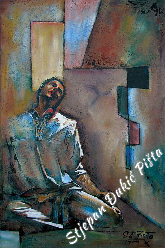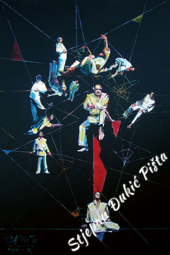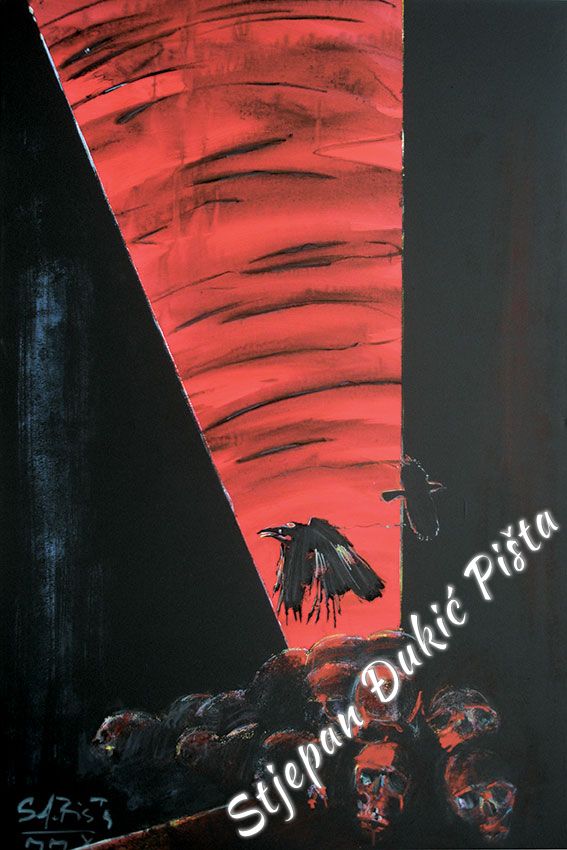 Stjepan Djukic Pista approached the "Ballads" in the original way. Being acquainted with Krleza's poetry, he didn't describe the situations and states, rather, he displayed the spirit and strength of the writers piece through an impressive act by the actor Adam Koncic . Observing the expressive actor's performance, his experience of certain parts of the "Ballads", he painted the layerness of the text over the character of the artist, face and body, position and gesture, just slightly accenting the precise portrait lines. The portraits aren't descriptive but are exceptionally persuasive, with a hint of the necessary realism. Djukic insists on the atmosphere, to recognize the content, on the relations of the meditative parties and those brought on the verge of screaming. The achieved charge by light accents, scene crashes and introducing iconographic fragments and the national symbols.